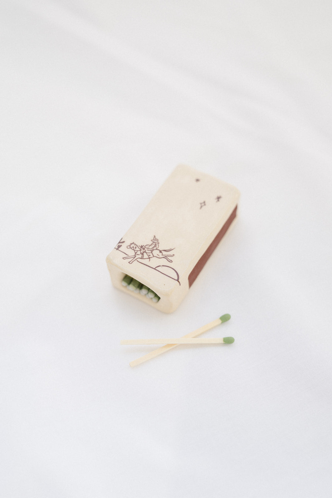 These hand-built matchboxes feature a hand-drawn southwestern design with star details on the left side, and a maroon strike strip on the right. 10 matches are include in each box. Replacements can be found at your local hardware store!